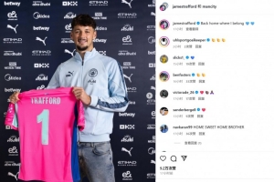 特拉福德曬出自己手持曼城1號球衣的簽約亮相照,并配文:“回到了我所屬的家?!?/p>