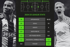 塞斯科(萊比錫,22歲):30場(chǎng)首發(fā)、3場(chǎng)替補(bǔ),13球5助攻,場(chǎng)均2.1射門、0.6關(guān)鍵傳球、1.2成功過(guò)人、0.6犯規(guī),場(chǎng)均獲評(píng)6.92分