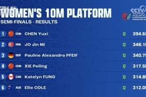 陳芋汐五跳總分394.65斷層領跑,領先第二名的朝鮮運動員趙珍美接近50分。另外,謝佩鈴以317.50分排名第四。