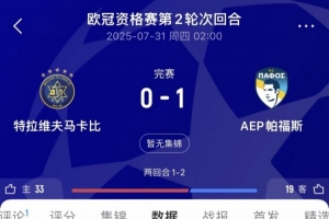 體育資訊8月1日訊 北京時間7月31日凌晨進(jìn)行的歐冠資格賽第二輪次回合比賽中,特拉維夫馬卡比0-1輸給帕福斯,兩回合總比分1-2不敵對手。