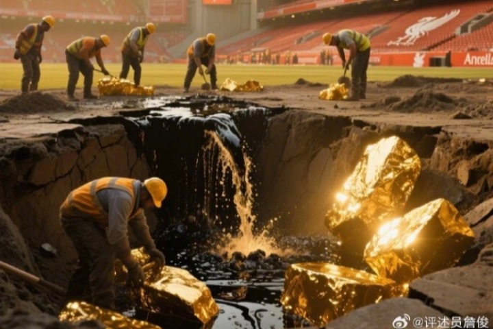 知名評述員詹俊對此評論道:“超過一億英鎊的首份報價被拒,紅軍球迷還得繼續(xù)挖坑才行......”并曬出了一張AI生成的“利物浦球場下挖石油和金礦”配圖。