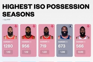 18-19賽季,哈登單打1280次(1.10為每次單打得分)