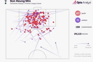 據Opta統(tǒng)計,2015-2016賽季孫興慜加盟熱刺以來,他在英超聯賽中參與198球,同期僅少于薩拉赫(270球)和凱恩(231球)。