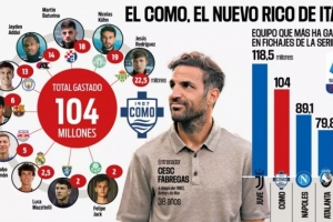 體育資訊8月6日訊 據(jù)西媒《阿斯報》發(fā)文表示,法布雷加斯執(zhí)教的科莫今夏已經(jīng)花費1.04億歐簽下10名新球員,轉(zhuǎn)會支出僅次于尤文,位列意甲第二多。在印尼富豪的支持下,科莫正在成為意甲的一支重要力量。