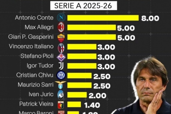 體育資訊08月06日訊 近日,意大利金融媒體Calcio e Finanza統(tǒng)計了25-26賽季意甲各隊主帥的年薪排行。