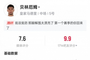 體育資訊6月27日訊 世俱杯小組賽H組第3輪,皇馬3-0戰(zhàn)勝薩爾茨堡紅牛。本場比賽,貝林厄姆首發(fā)出戰(zhàn),送出1次助攻,3次過人成功,2次關(guān)鍵傳球,評分7.6。