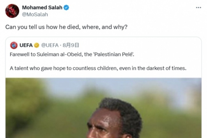 體育資訊08月10日訊 歐足聯(lián)官方此前發(fā)文,向不幸喪生的巴勒斯坦球星奧貝德簡(jiǎn)短致哀。利物浦球星薩拉赫轉(zhuǎn)發(fā)了這則帖文,并發(fā)出了三個(gè)疑問(wèn)。