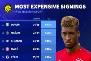 體育資訊8月16日訊 利雅得勝利官方宣布簽下拜仁邊鋒科曼,德國轉會市場列出了利雅得勝利隊史最貴引援排名,杜蘭7700萬歐居首,科曼2500萬歐排在并列第7位。