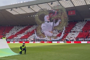 體育資訊8月16日訊 桑德蘭回歸英超后迎來首戰(zhàn),與西漢姆的比賽正在進(jìn)行當(dāng)中,黑貓球迷們打出巨幅TIFO,給球隊(duì)打氣。