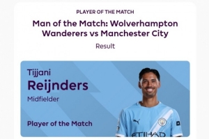 賽后據(jù)英超官方消息,曼城中場(chǎng)賴因德斯以52%的得票當(dāng)選此役全場(chǎng)最佳球員。