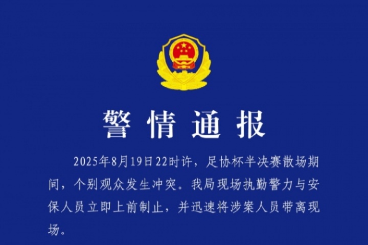 2025年8月19日22時許,足協(xié)杯半決賽散場期間,個別觀眾發(fā)生沖突。我局現(xiàn)場執(zhí)勤警力與安保人員立即上前制止,并迅速將涉案人員帶離現(xiàn)場。