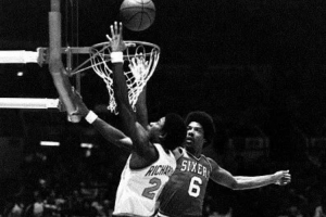 1976年J博士君臨費城,之后七年,費城四進總決賽,兩進東部決賽,1979年分區(qū)半決賽3比4輸給冰人領(lǐng)銜的馬刺已算最差。1983年,費城完成摩西·馬龍預(yù)言的“4!4!4!”,橫掃紐約,4比1破雄鹿,總決賽橫掃湖人奪冠。
