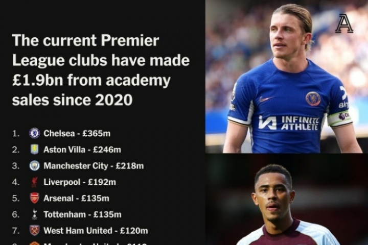 體育資訊08月22日訊 TA統(tǒng)計(jì)了自2020年以來,英超20隊(duì)的青訓(xùn)球員出售情況,切爾西3.65億斷檔第1。