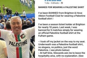 布萊頓賽季票持有者羅杰-韋德(Roger Wade)社媒發(fā)文,表示自己因身穿巴勒斯坦國家隊(duì)官方球衣,被俱樂部禁賽五場。