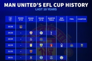 最近十年,曼聯(lián)曾在16-17賽季以及22-23賽季獲得該項(xiàng)賽事冠軍,此前最差戰(zhàn)績(jī)是18-19賽季第三輪不敵德比郡,21-22賽季第三輪不敵西漢姆。