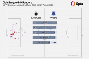 據(jù)OptaJohan的數(shù)據(jù)統(tǒng)計(jì),布魯日6-0大勝流浪者,這是他們自2001年9月27日(7-1尼科西亞奧林匹亞科斯)以來在歐戰(zhàn)中最大比分的勝利。