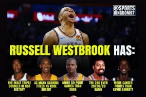 體育資訊6月29日訊 今天,NBA名宿奧尼爾轉(zhuǎn)發(fā)了一則關(guān)于威少多項(xiàng)數(shù)據(jù)榮譽(yù)的報道,詳情如下: