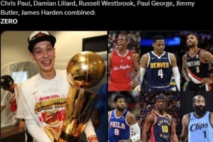 “哈登、保羅、利拉德、威少、喬治和巴特勒加起來0冠,但林書豪有1冠?!盢BA Memes寫道。