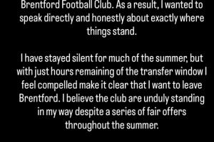 這個(gè)夏天我大多保持沉默,但在轉(zhuǎn)會(huì)窗僅剩數(shù)小時(shí)之際,我不得不明確表示:我希望離開布倫特福德。盡管整個(gè)夏天收到了多份合理報(bào)價(jià),我認(rèn)為俱樂部正在過度阻撓我的轉(zhuǎn)會(huì)。