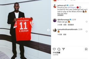 杰克遜曬出手拿拜仁11號(hào)球衣的照片,并寫道:“很自豪能加盟拜仁,對這個(gè)新挑戰(zhàn)感到興奮,迫不及待想要在安聯(lián)球場踢球了!Mia San Mia!!”