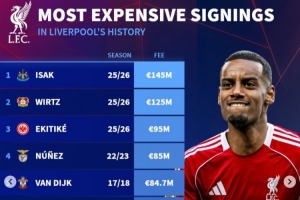 體育資訊9月2日訊 利物浦壓哨簽下今夏標王伊薩克,《轉會市場》也統計了紅軍隊史最貴買人情況,前三均為今夏新援。