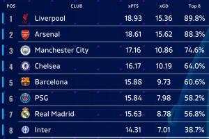 機構預測聯(lián)賽階段(排名、球隊、預期積分、預期凈勝球、前八概率):