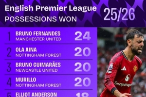 體育資訊9月3日訊 數(shù)據(jù)機(jī)構(gòu)squakwa統(tǒng)計(jì)了新賽季英超球員贏得球權(quán)情況,B費(fèi)獨(dú)自領(lǐng)跑。