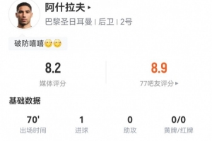 體育資訊6月30日訊 巴黎在世俱杯16強(qiáng)戰(zhàn)4-0領(lǐng)先邁阿密?chē)?guó)際,阿什拉夫本場(chǎng)數(shù)據(jù)如下: