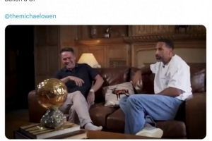 歐文接受費迪南德的采訪,并展示自己獲得的2001年金球獎杯,費迪南德社媒曬出視頻,配文:“金球、金球、金球、金球?!?/p>