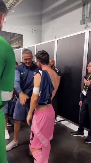 賽后在球員通道,梅西與恩里克、多納魯馬、金彭貝等人擁抱攀談。