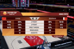 體育資訊9月5日訊 U16男籃亞洲杯1/4決賽,中國(guó)隊(duì)半場(chǎng)42-31領(lǐng)先巴林隊(duì)。