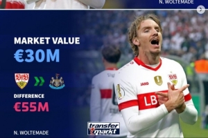 沃爾特馬德(斯圖加特→紐卡斯?fàn)枺荷韮r(jià)3000萬(wàn),轉(zhuǎn)會(huì)費(fèi)8500萬(wàn),溢價(jià)5500萬(wàn)歐元