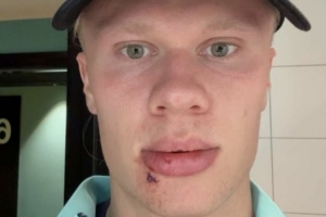 哈蘭德在今日通過社媒曬出自拍照,可以清洗看到嘴唇下的傷口,他對此解釋稱:“剛剛被公交車門給撞了??縫了三針??”