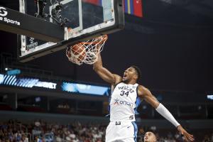 今年歐錦賽至今,字母哥出場(chǎng)4次,場(chǎng)均上陣28.8分鐘可以砍下30分9.8籃板4助攻,投籃命中率是72.5%,三分命中率是33.3%,罰球命中率為61.3%,場(chǎng)均正負(fù)值+15.3,平均效率值為33.5。