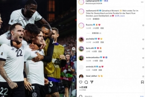 他也在賽后通過社媒曬出全隊的慶祝照,并配文:“真是讓人雞皮疙瘩都起來了??我身披德國隊?wèi)?zhàn)袍的首粒進球,為球隊贏下了三分!無比激動,無比感恩。”