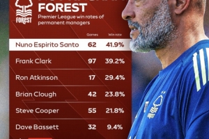 體育資訊9月9日訊 諾丁漢森林官宣努諾下課,根據(jù)數(shù)據(jù)統(tǒng)計努諾是森林隊史英超勝率最高的主帥。