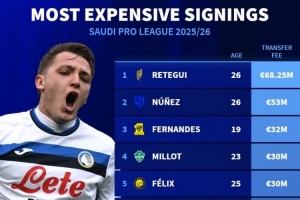 體育資訊9月12日訊 沙特今夏轉(zhuǎn)會(huì)窗已經(jīng)關(guān)閉,《轉(zhuǎn)會(huì)市場》也統(tǒng)計(jì)了沙特今夏最貴引援榜,雷特吉居首,5人年齡不高于23歲。