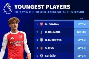 體育資訊9月13日訊 德轉(zhuǎn)列本賽季英超截止目前出場最年輕球員排行,道曼15歲7個月最年輕,恩古莫哈第二。