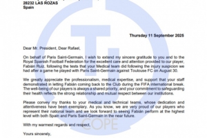 信中寫道:“尊敬的主席先生,親愛的拉斐爾:我謹代表巴黎圣日耳曼俱樂部,向您以及西班牙皇家足球協(xié)會致以誠摯的感謝,感謝您們對我俱樂部球員法比安-魯伊斯的細心照料和周到關(guān)懷。此前,在我們懷疑法比安在8月30日對陣圖盧茲的比賽中受傷后,貴方醫(yī)療團隊對他進行了檢查?!?/p>