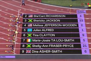 最后一次參加世錦賽女子飛人大戰(zhàn)的牙買加傳奇弗雷澤11秒03獲得第六名。