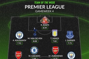后衛(wèi):胡桑諾夫(曼城,7.92分)、范德文(熱刺,8.08分)、明斯(阿斯頓維拉,7.82分)、詹姆斯-加納(埃弗頓,7.75分)