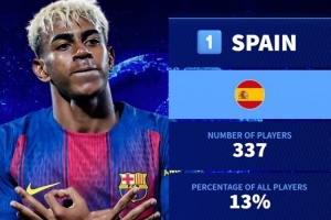 體育資訊9月16日訊 德國(guó)轉(zhuǎn)會(huì)市場(chǎng)統(tǒng)計(jì)了五大聯(lián)賽各國(guó)球員的數(shù)量,并列出榜單,西班牙337人居首。