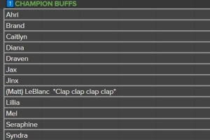 阿貍、布蘭德、凱特琳、黛安娜、德萊文、賈克斯、金克絲、樂芙蘭、莉莉婭、梅爾、薩勒芬妮、辛德拉