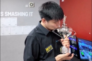 比賽間隙WST官推更新了一段趙心童領(lǐng)取復(fù)刻版世錦賽冠軍獎杯的視頻,視頻中趙心童笑著打趣道“這也太小了吧”!引發(fā)周圍工作人員歡笑,之后趙心童親吻了冠軍獎杯復(fù)刻品。