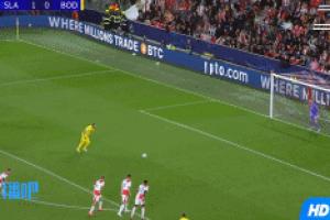 比賽第54分鐘,博德閃耀獲得一個點球,但霍格主罰的點球被布拉格門將斯坦尼克神勇?lián)涑?,錯失扳平比分的良機!