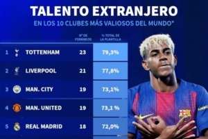 體育資訊9月18日訊 德國(guó)轉(zhuǎn)會(huì)市場(chǎng)統(tǒng)計(jì)了身價(jià)排名前十俱樂(lè)部的外籍球員占比,并列出榜單,在身價(jià)前十俱樂(lè)部之中,熱刺外援占比79.3%最高,巴薩43.5%最低。