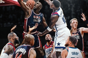 夢一隊陣容:喬丹、魔術(shù)師約翰遜、巴克利、卡爾-馬龍、尤因、皮蓬、大衛(wèi)-羅賓遜、克里斯-穆林、克萊德-德雷克斯勒、斯托克頓、克里斯蒂安-萊特納。