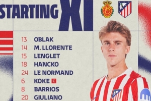 馬競首發(fā):13-奧布拉克、14-馬科斯-略倫特、15-朗格萊、18-漢茨科、24-勒諾爾芒、6-科克、8-巴勃羅-巴里奧斯、20-朱利亞諾-西蒙尼、23-尼古拉斯-岡薩雷斯、19-阿爾瓦雷斯、22-拉斯帕多里