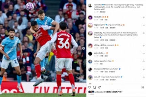 曼城球員魯本-迪亞斯也在社媒曬出本場(chǎng)照片,配文寫(xiě)道:“為今天全隊(duì)的拼搏精神感到驕傲,很失望沒(méi)能拿到3分,我們帶著能量與斗爭(zhēng)精神繼續(xù)前進(jìn)!”