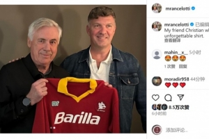 安切洛蒂獲贈自己效力羅馬期間的球衣,他在社交媒體上曬照:“我的朋友克里斯蒂安收藏了一件令人難忘的球衣。”